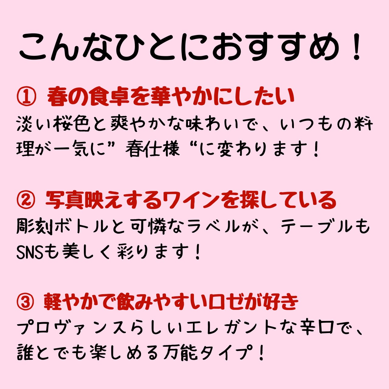 世界的に愛されるロゼの名産地 フランス・プロヴァンスらしい、エレガントで軽やかなスタイルは、お花見や春のホームパーティーにもぴったり。可憐なラベルと美しいボトルは写真映えも良く、テーブルを一瞬で“春仕様”に変えてくれます。